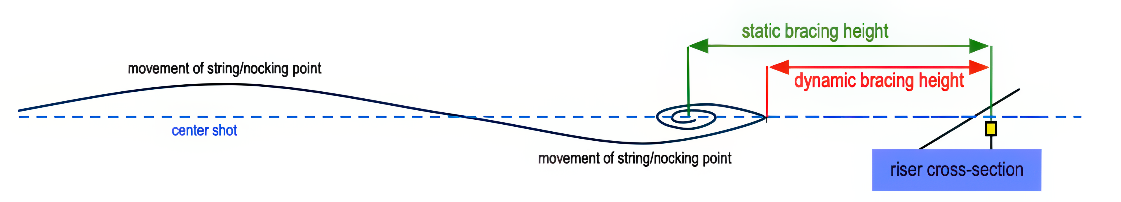 On a well designed and well made bow, the upper limb is slightly stronger than the lower limb. The effect is that when shot the arrow will lift up and away from the arrow rest, so helping clearance. It is necessary to position the nocking point on the string a few mm above horizontal so the arrow clearance and arrow flight are coordinated.
