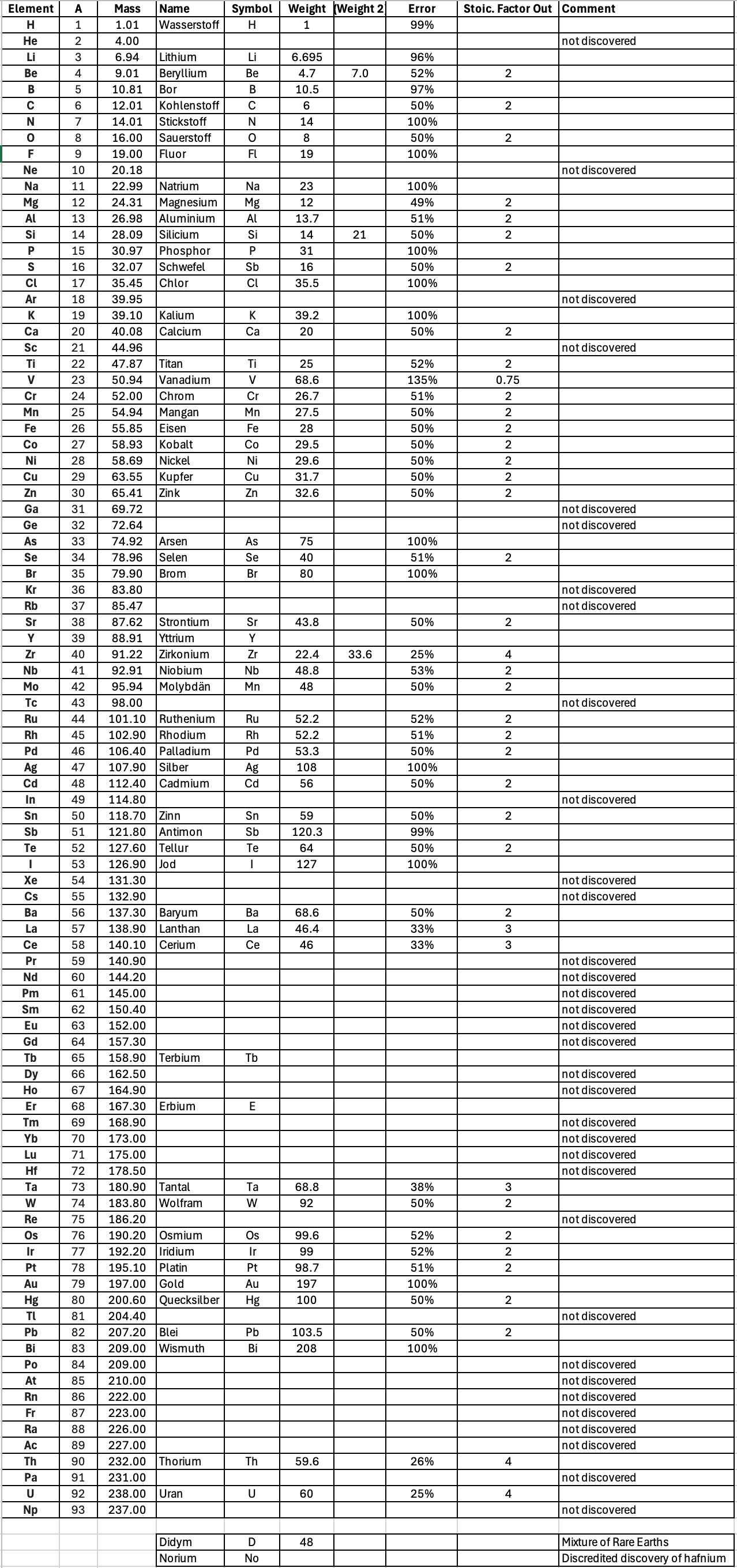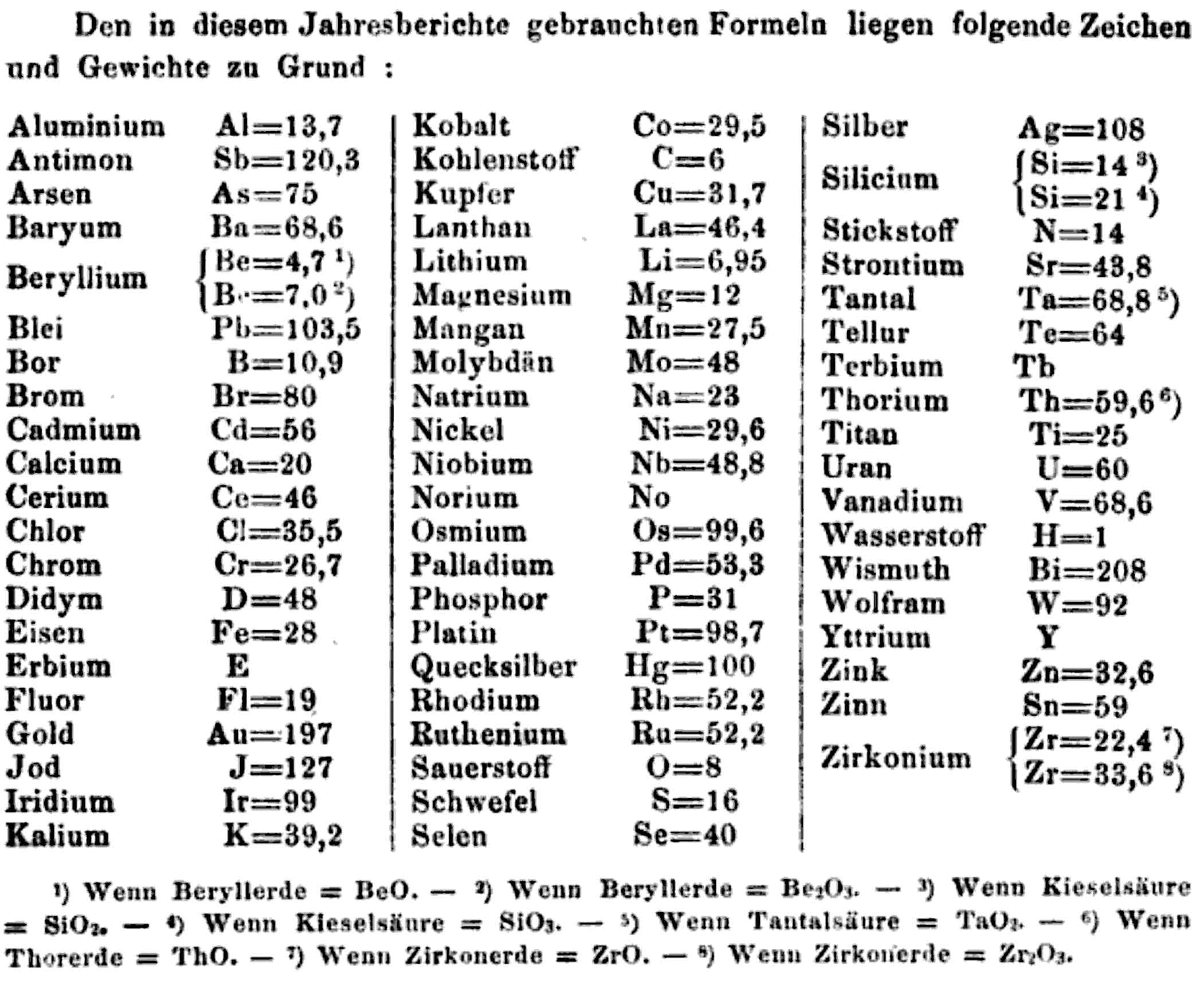 "A list of the known chemical elements with their atomic weights in 1858. The list is far more comprehensive than the list given in the important Cannazzario letter (also of 1858), but it contains many of the stoichiometric errors which plagued chemistry at the time. Oxygen (Sauerstoff) is given as having a weight of 8 which would have caused many of the other atomic weights to be out by a factor of 2 or 3.