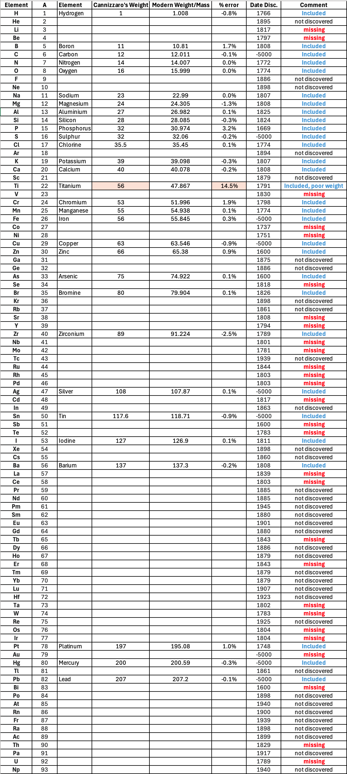Below is a list of the elements showing which ones were included by Cannizzaro and which one were ommitted (because they had not been discovered) or are strangely missing. Odd ommissions (to the modern eye) include: Lithium, Beryllium, Cobalt, Nickel, Palladium, Tungsten and Gold.