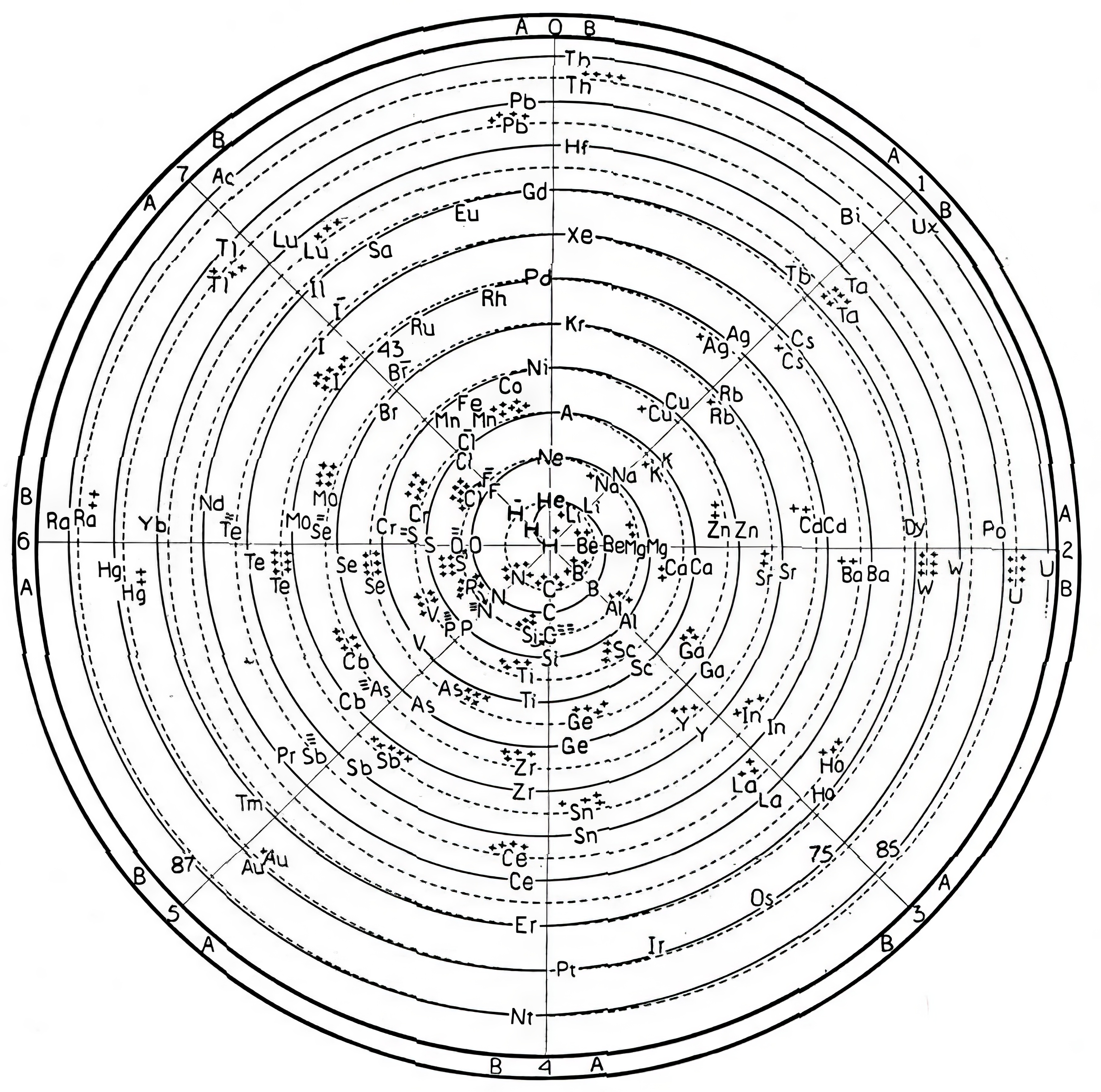 Ingo Hackh's spiral periodic table of 1914, from Das Synthetisches System der Atome, Hamburg, Hephaestos.