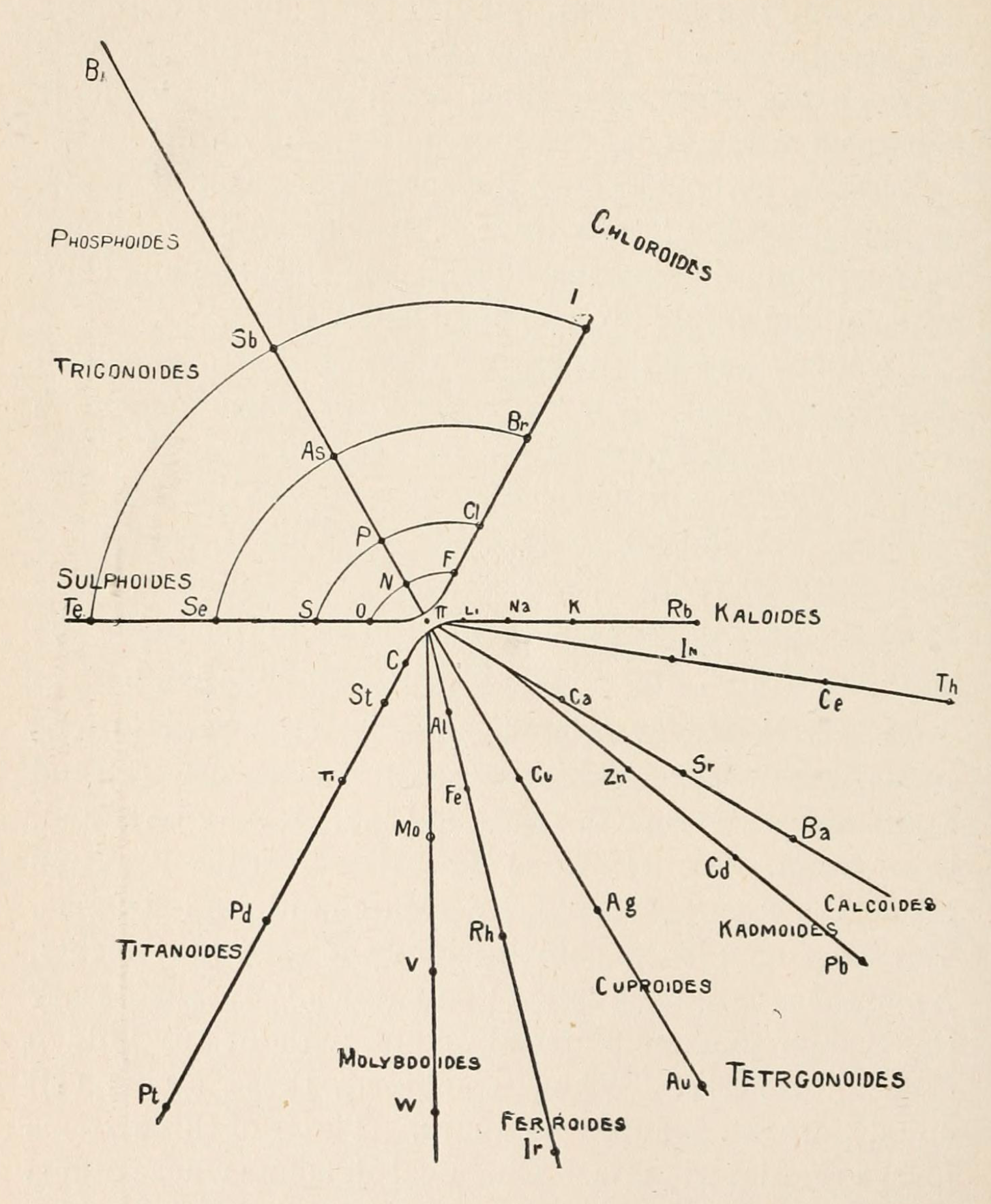 Johnstone Stoney's Spiral, taken from A. E. Garrett's The Periodic Law (page 167, 1909 pub. D. Appleton And Company). The reference is given – page 167 – is: Phil. Mag. [6], 4, pp 411 et seq.; Proc. Roy. Soc., 1888, p115.