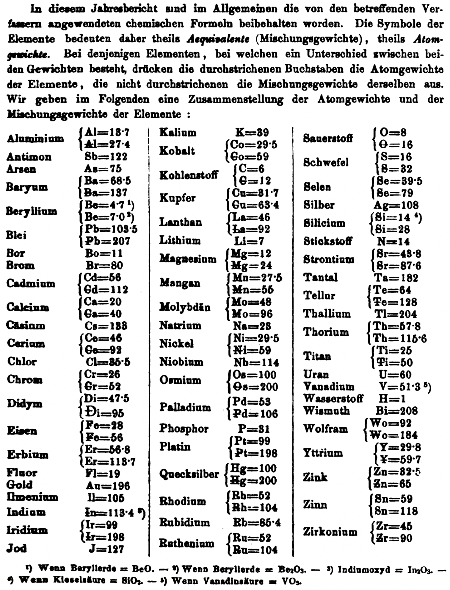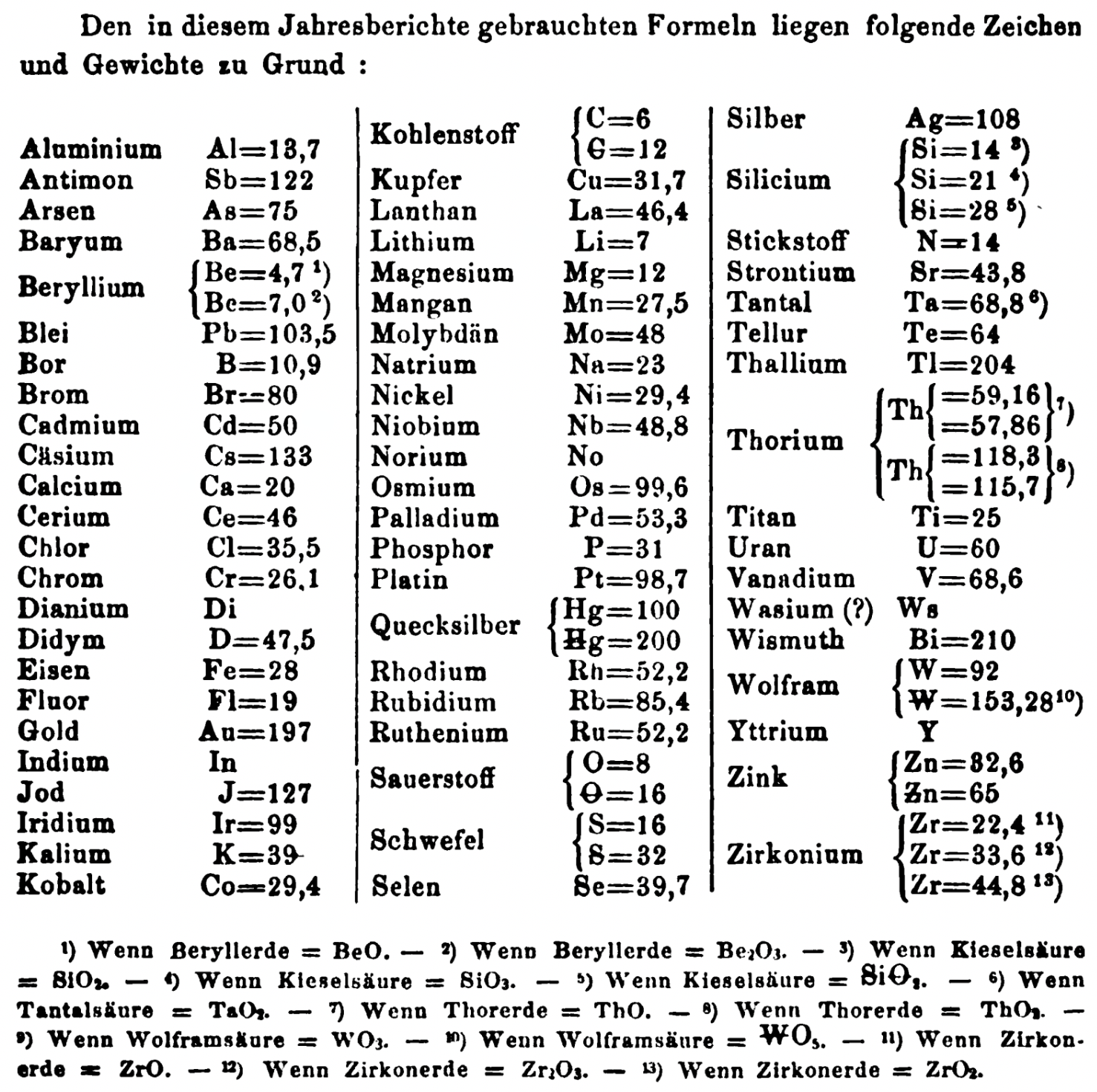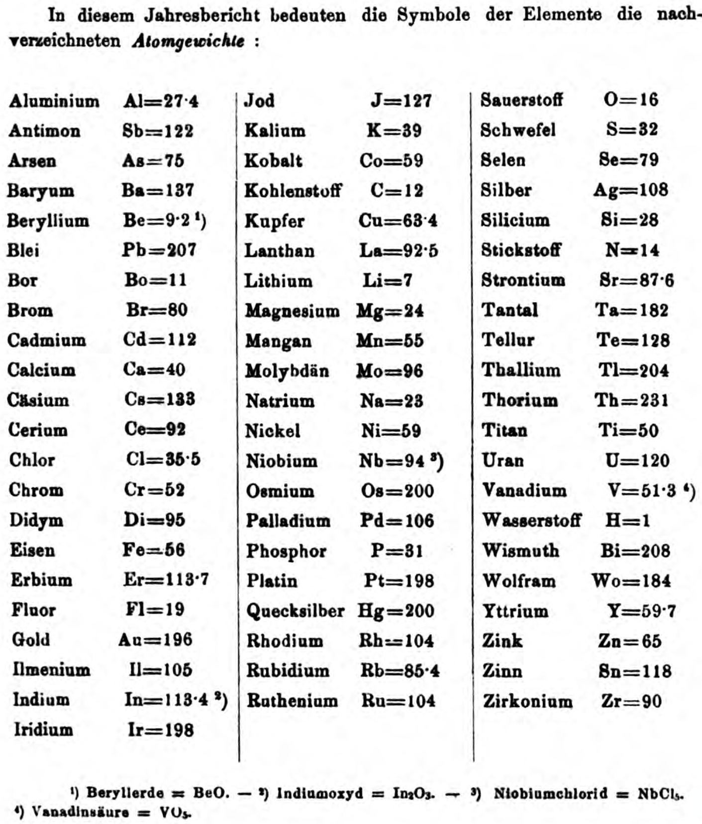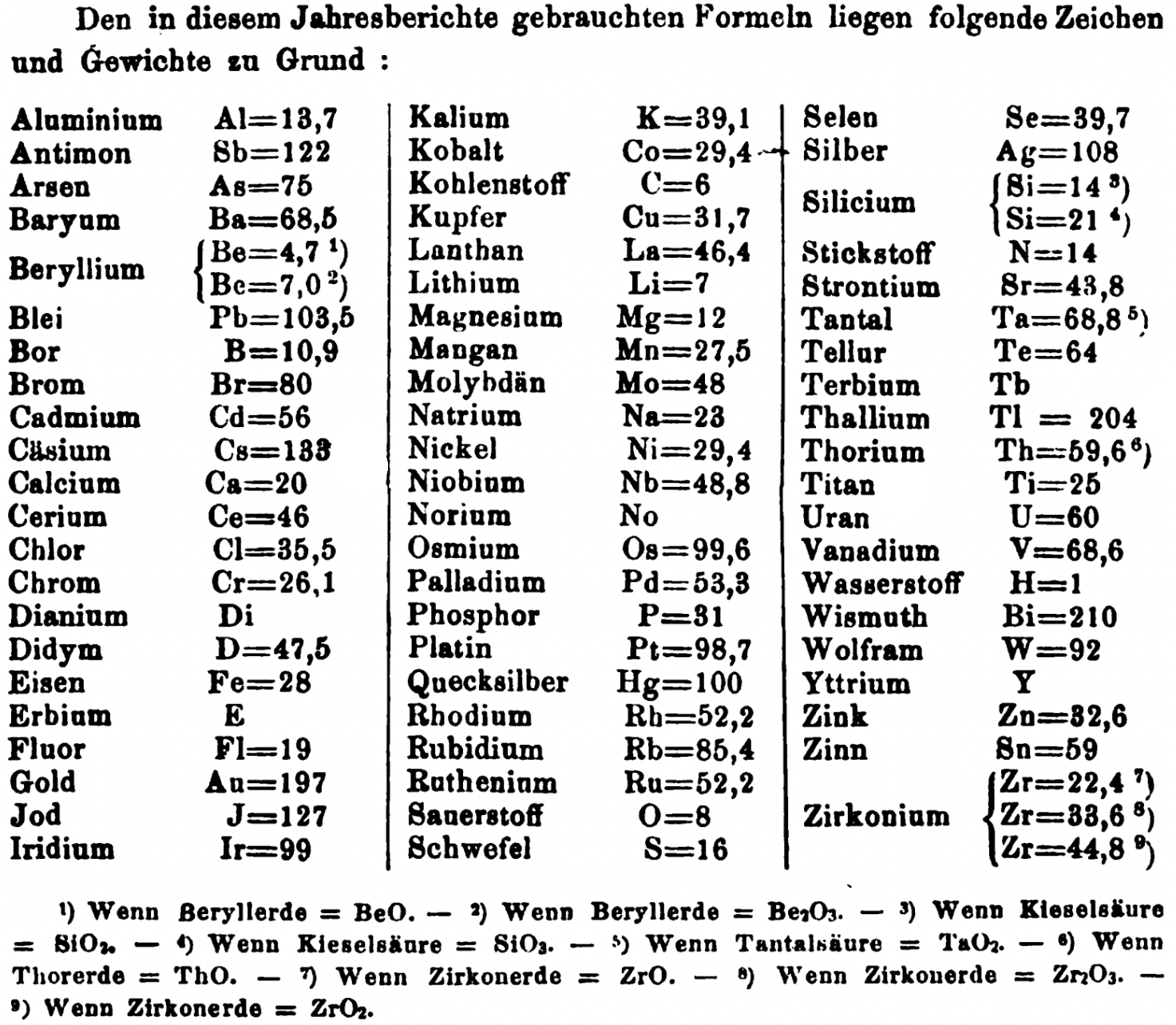 "Every year the annual report started with a list of the known chemical elements and their atomic weights, however, to the modern eye there were many systematic errors. For example, oxygen (Sauerstoff) is given as having a weight of 8 which would have caused – due to the importance of oxides – other atomic weights to be out by a factor of 2 or 3. Once a list of correct atomic weights was known, it would be possible to construct a periodic table of the elements.