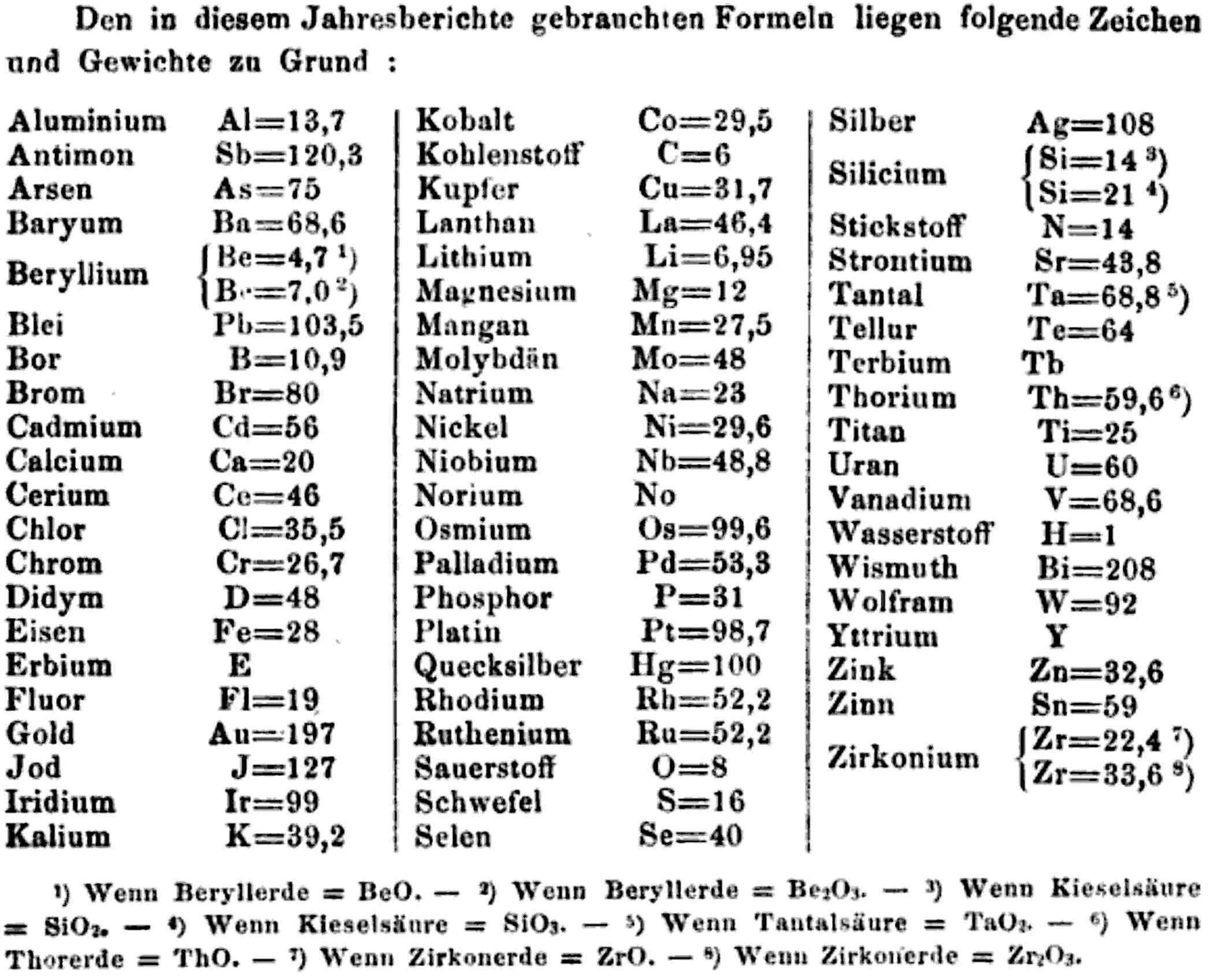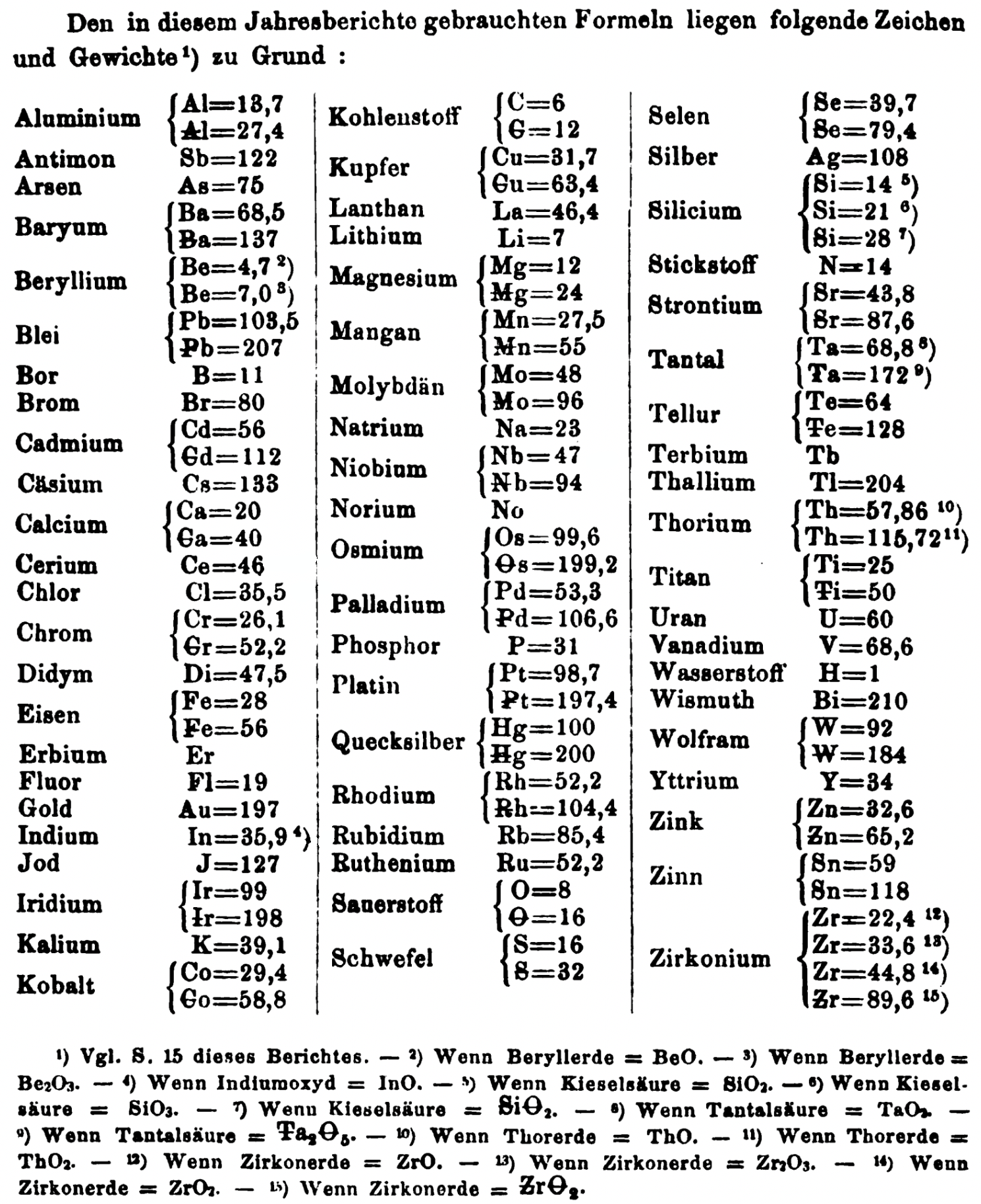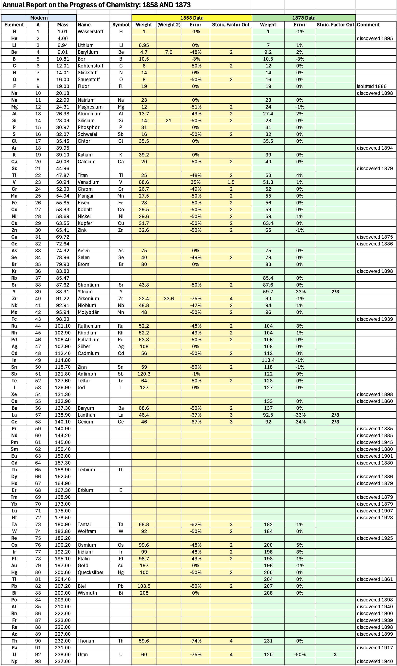 "Every year the annual report started with a list of the known chemical elements and their atomic weights, however, to the modern eye there were many systematic errors. For example, oxygen (Sauerstoff) is given as having a weight of 8 which would have caused – due to the importance of oxides – other atomic weights to be out by a factor of 2 or 3. Once a list of correct atomic weights was known, it would be possible to construct a periodic table of the elements.