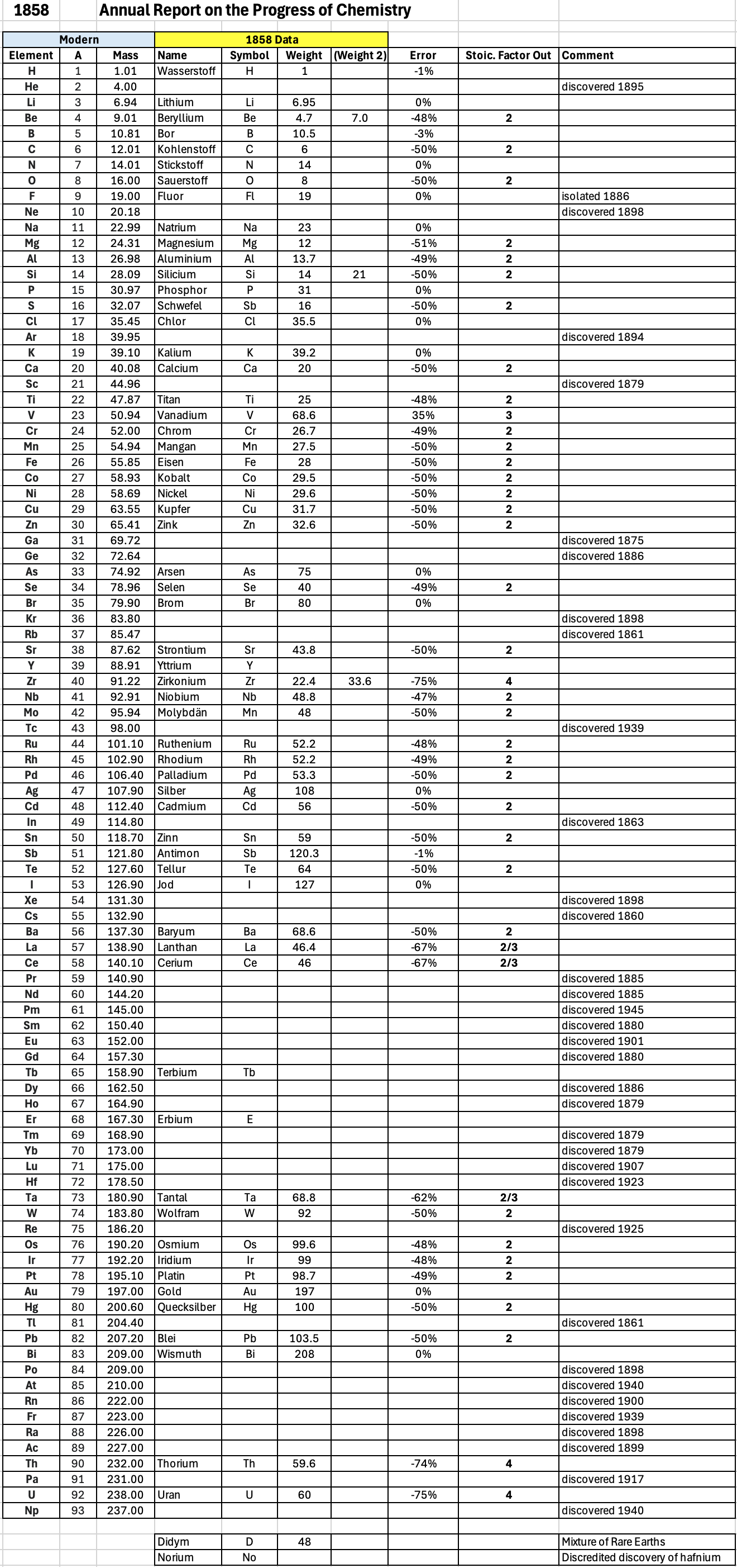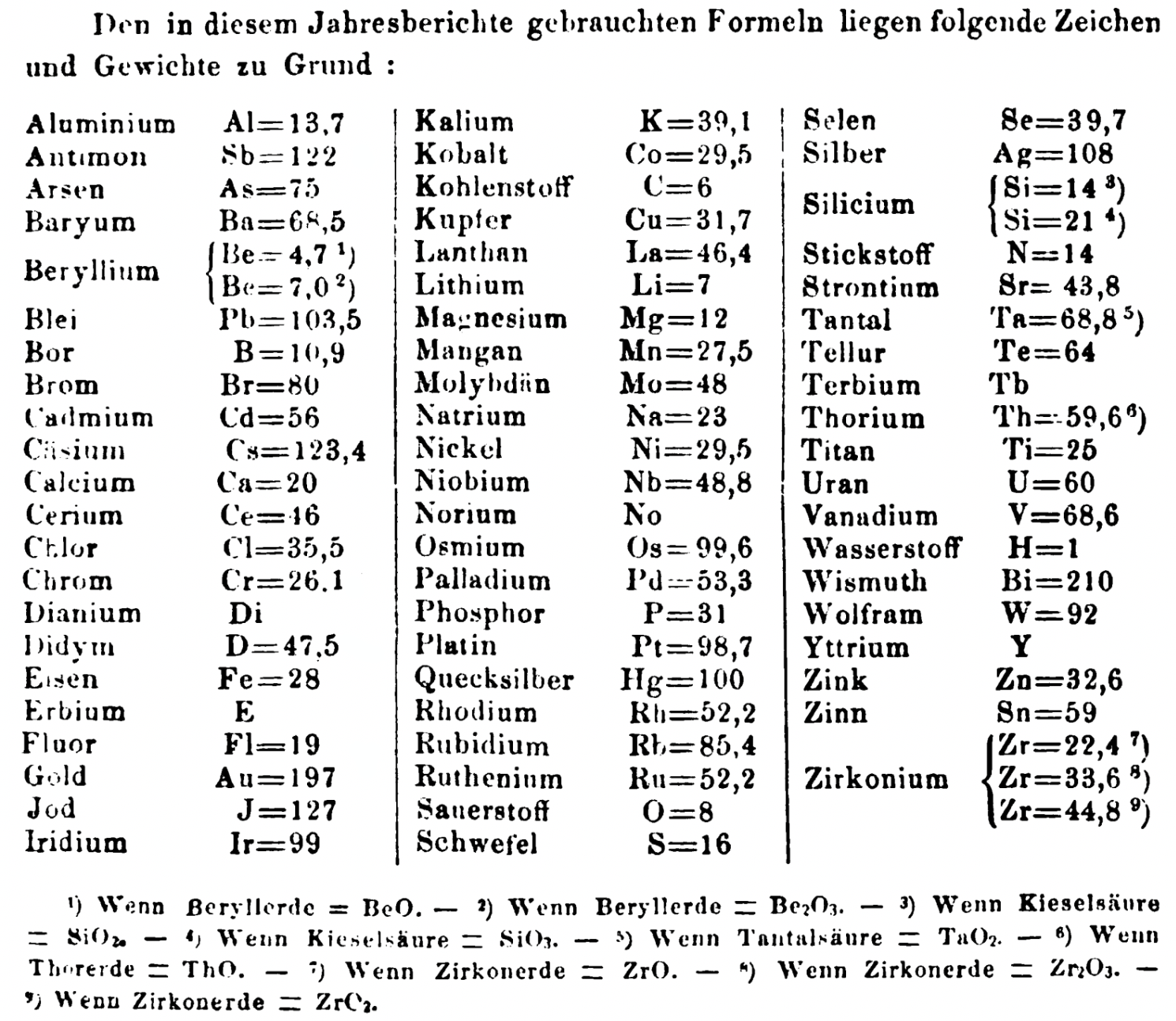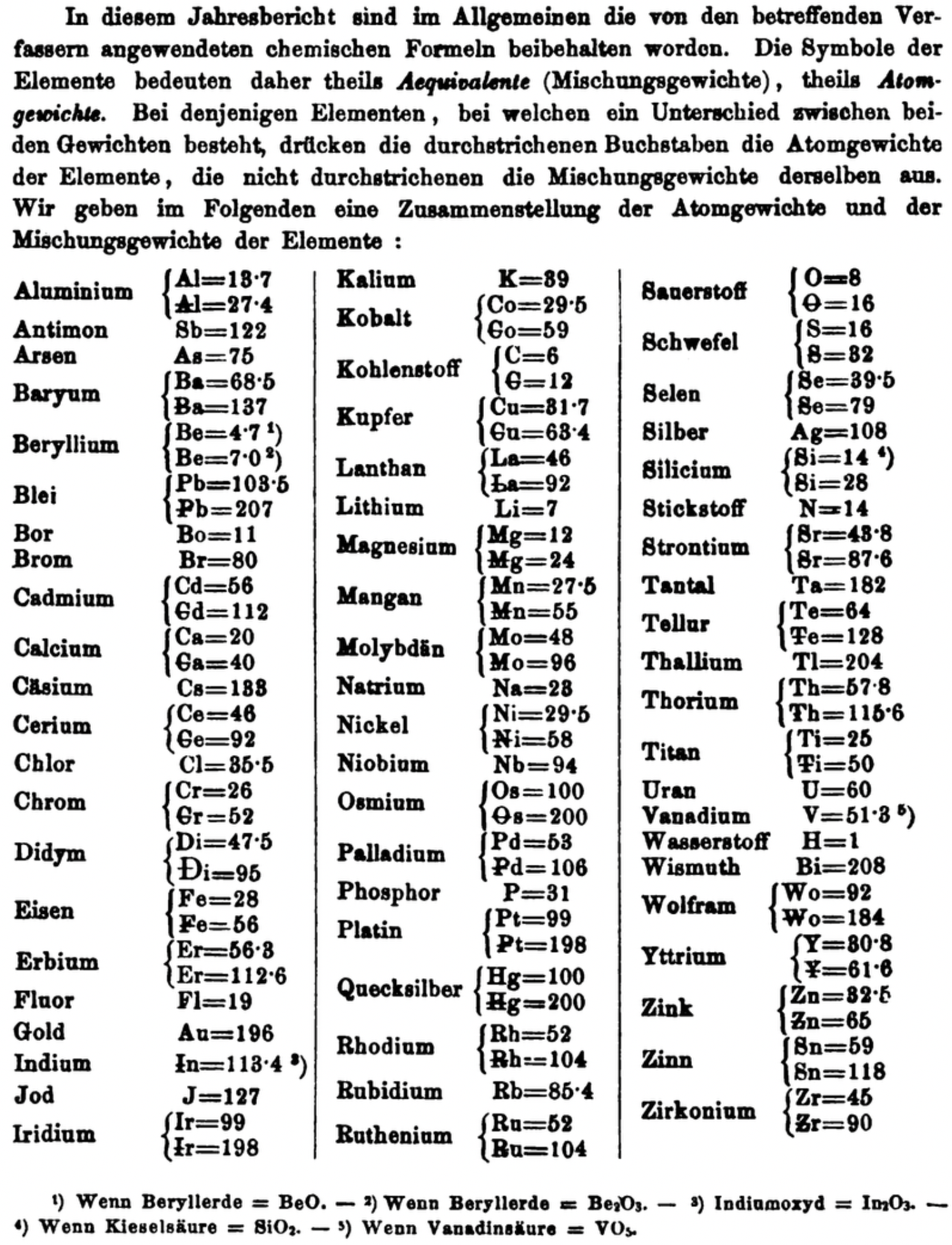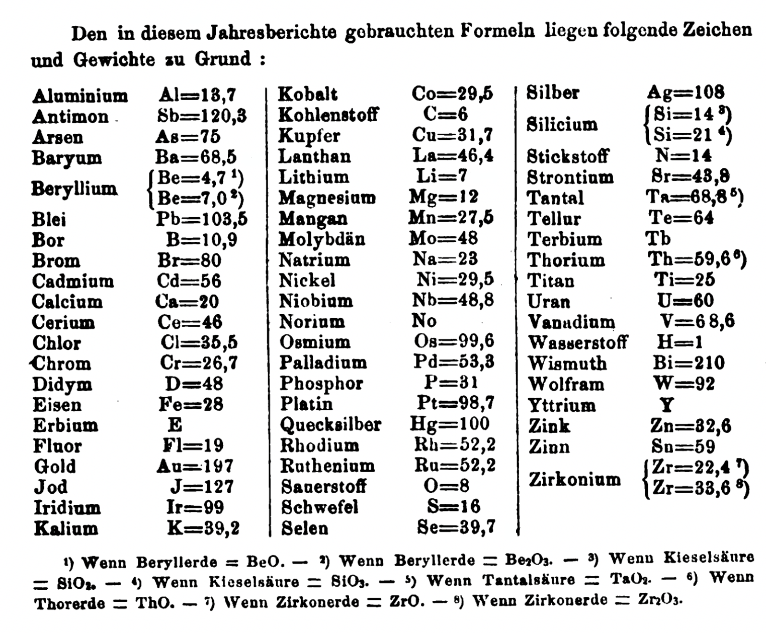 "Every year the annual report started with a list of the known chemical elements and their atomic weights, however, to the modern eye there were many systematic errors. For example, oxygen (Sauerstoff) is given as having a weight of 8 which would have caused – due to the importance of oxides – other atomic weights to be out by a factor of 2 or 3. Once a list of correct atomic weights was known, it would be possible to construct a periodic table of the elements.