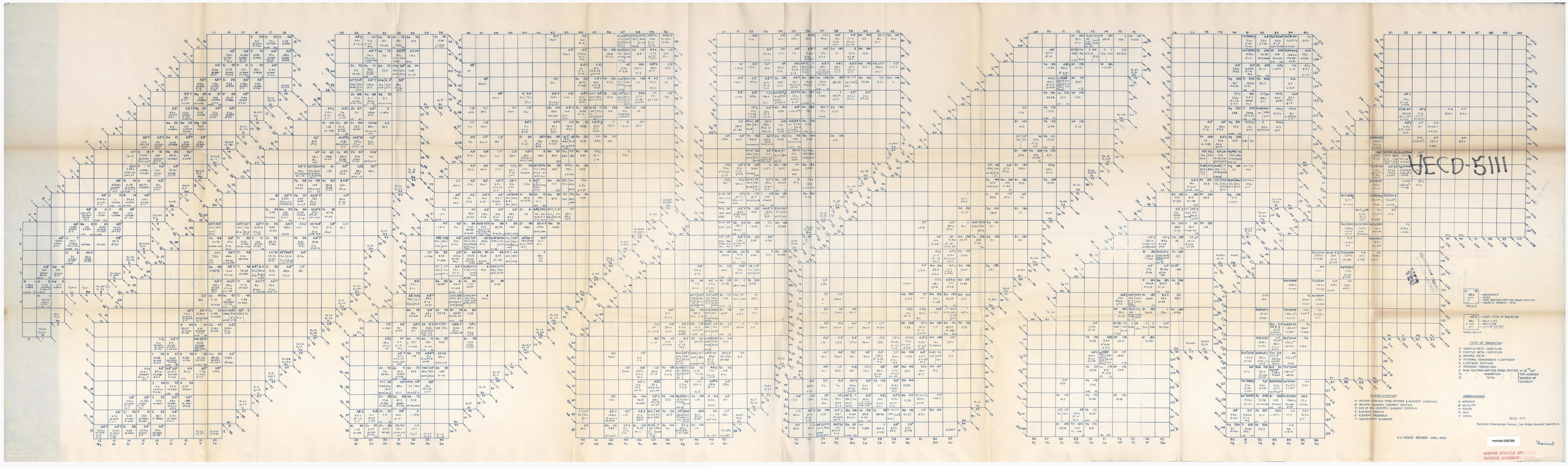 Below is the original 1948 Segrè chart, ref: Segrè, Emilio. Segrè Chart [Isotope Chart], technical drawing, April 1948; Oak Ridge, Tennessee. (https://digital.library.unt.edu/ark:/67531/metadc100789/: accessed February 17, 2026), University of North Texas Libraries, UNT Digital Library, https://digital.library.unt.edu; crediting UNT Libraries Government Documents Department: