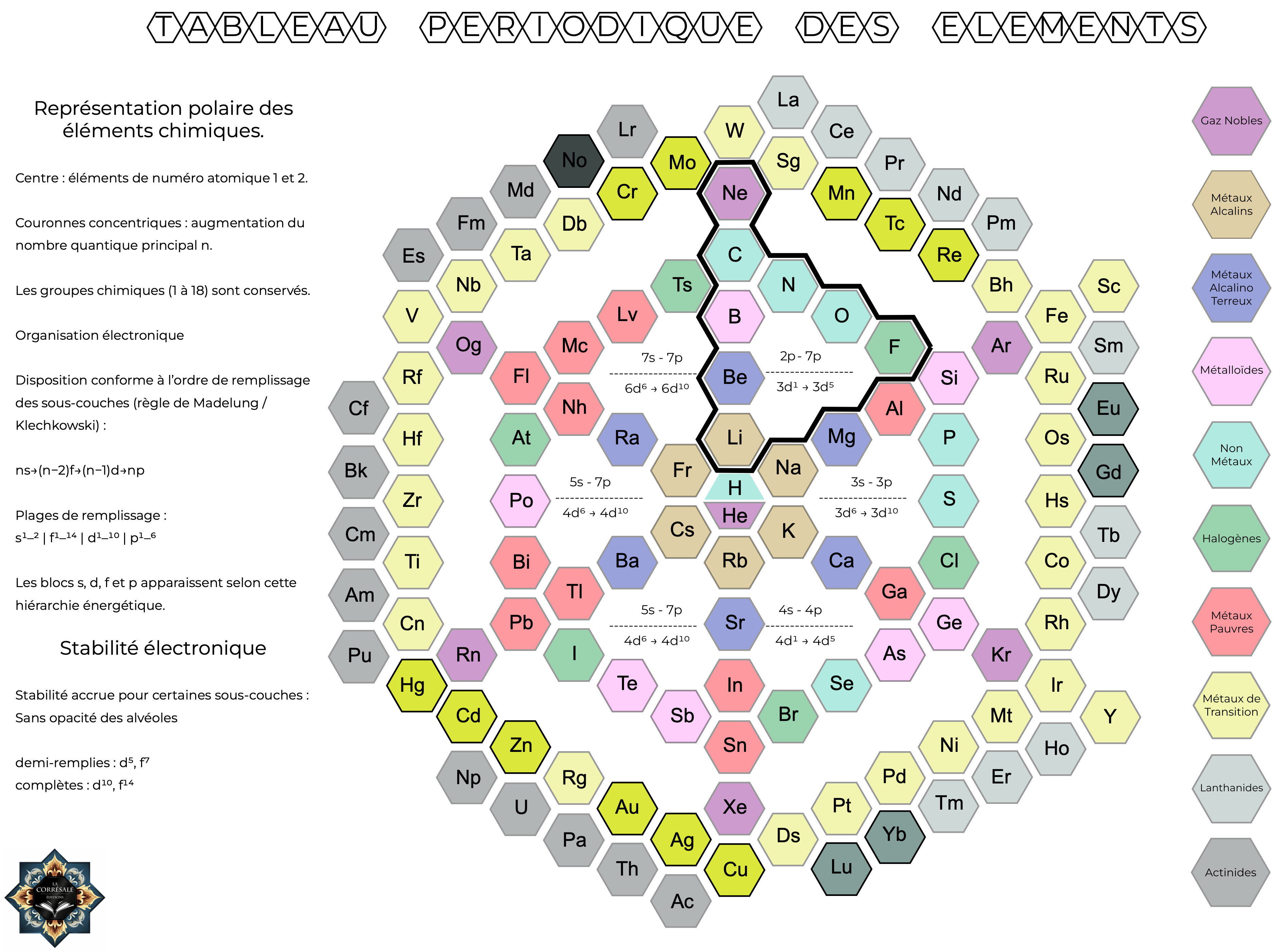 "The model is a radial (hexagonal) construction with hydrogen and helium positioned at the center, and successive concentric layers corresponding to principal quantum numbers (n = 1-7). The layout follows the Madelung (Klechkowski) filling order, so that the s, p, d, and f blocks arise naturally from the geometric structure.