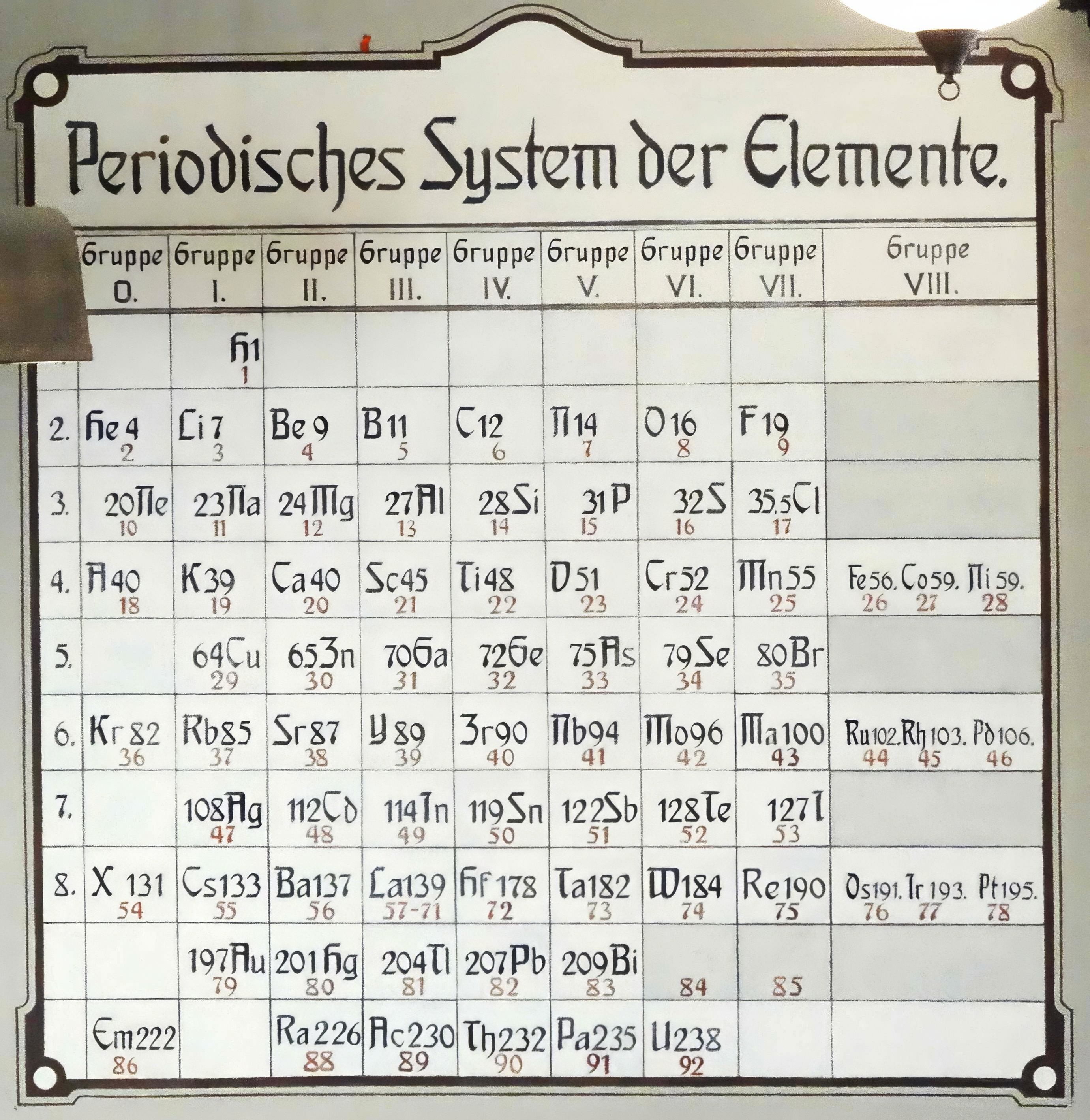 "Periodisches System der Elemente (1904-1945, now at the Gdansk University of Technology): lack of elements: 84 polonium Po (though discovered as early as in 1898 by Maria Sklodowska-Curie), 85 astatine At (1940, in Berkeley), 87 francium Fr (1939, in France), 93 neptunium Np (1940, in Berkeley) and other actinides and lanthanides. Old symbols for: 18 argon Ar (here: A), 43 technetium Tc (Ma, masurium, 1925, dismissed as an error and finally confirmed in 1937, Palermo), 54 xenon Xe (X), 86 radon, Rn (Em, emanation)."