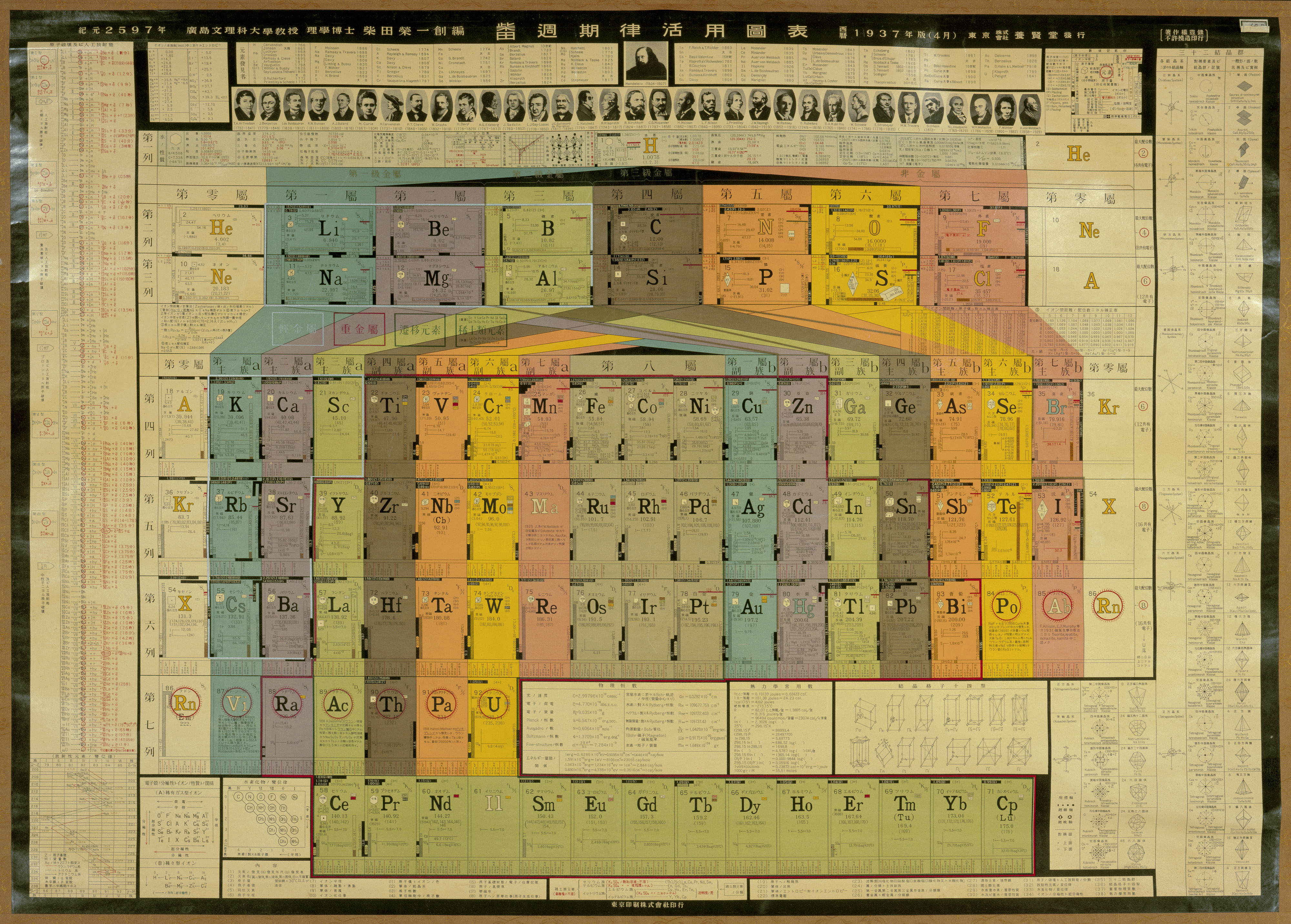 "From 1937 and used in Japanese high schools. The periodic table uses the von Antropoff format, and aside from the element data, it also has a data about the half-lives of known radioactive isotopes, physical constants, crystal structures, and much more. Notably it has the claimed elements masurium, illinium, alabamine, and virginium listed."