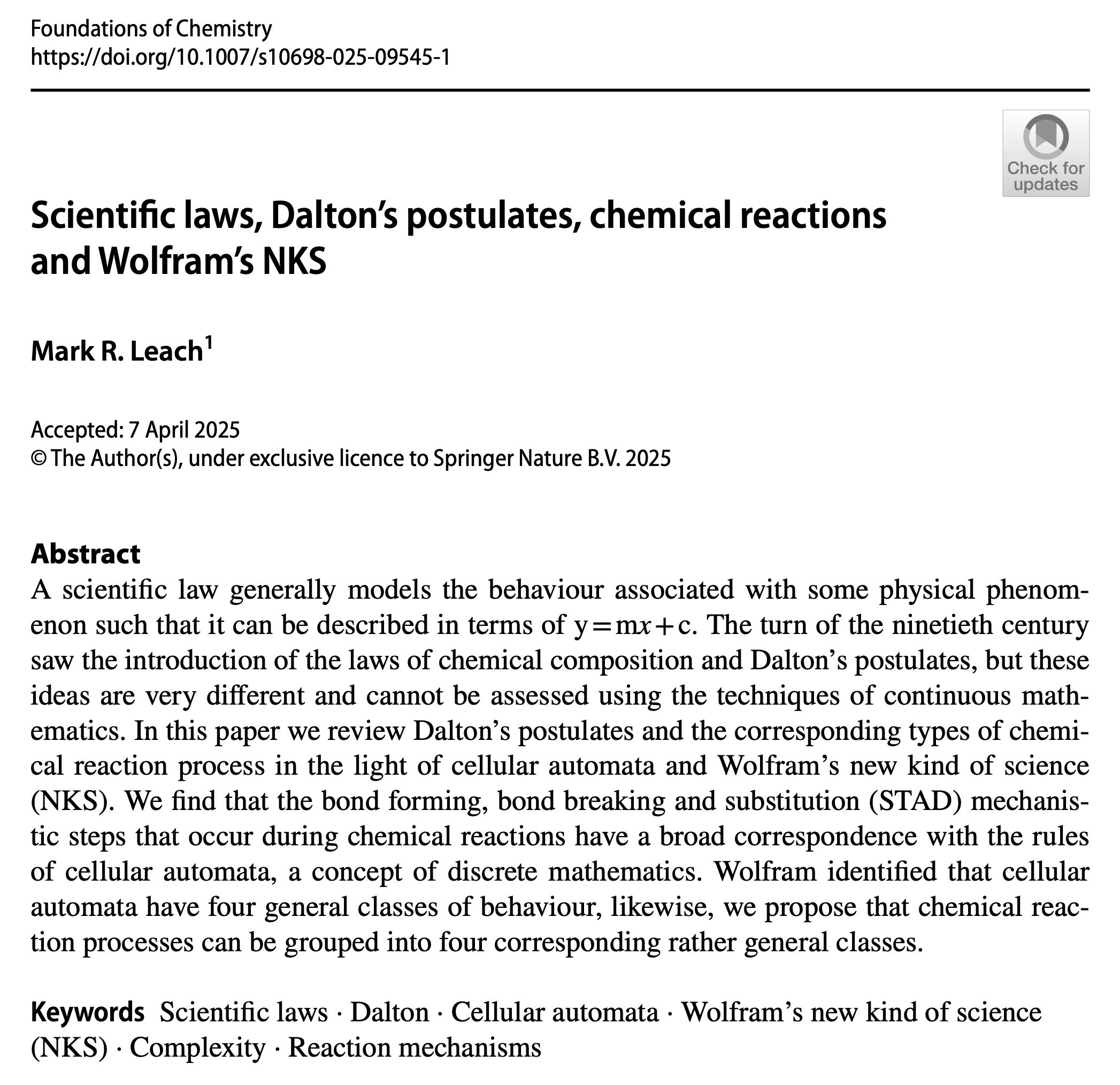 This page gives links to a paper, written by Dr Mark R. Leach and published in Foundations of Chemistry, that discusses the classification of chemical reactions in the context of Wolframs New Kind of Science.